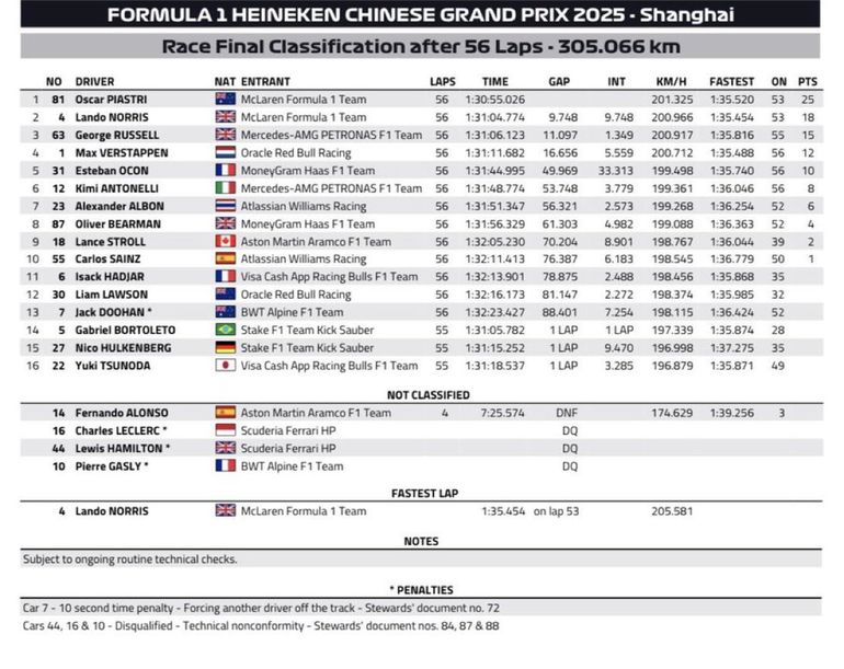 Tras la victoria de Piastri en el Gran Premio de China, la FIA sancionó a los pilotos de Ferrari y otro más.