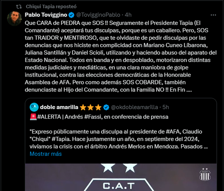 El presidente de la Asociación del Fútbol Argentino (AFA), Claudio Chiqui Tapia, utilizó su cuenta en la red social X para repostear la publicación del tesorero y presidente del Consejo Federal Pablo Toviggino, en respuesta al pedido de disculpas realizado por el máximo mandatario de Talleres, Andrés Fassi.