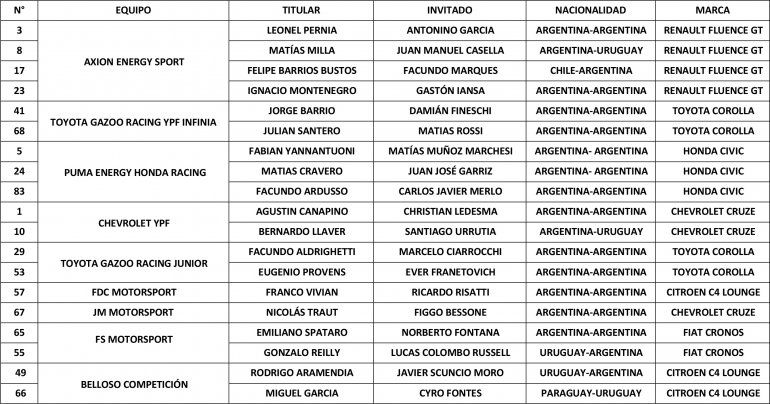 En tanto, Emiliano Spataro y Norberto Fontana compartirán uno de los Fiat del FS Motorsport y Bernardo Llaver confío nuevamente en el uruguayo Santiago Urrutia tras el podio que consiguieron juntos en 2017.