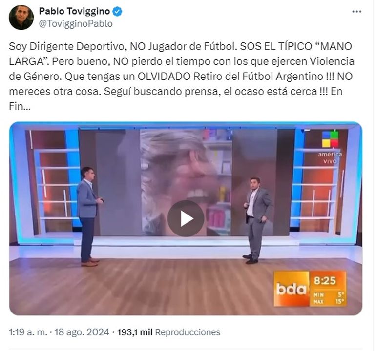 Ante este panorama, el tesorero de AFA utilizó su red social "X" (ex Twitter) y fue contundente contra el futbolista: "Soy Dirigente Deportivo, NO Jugador de Fútbol. SOS EL TÍPICO “MANO LARGA”".