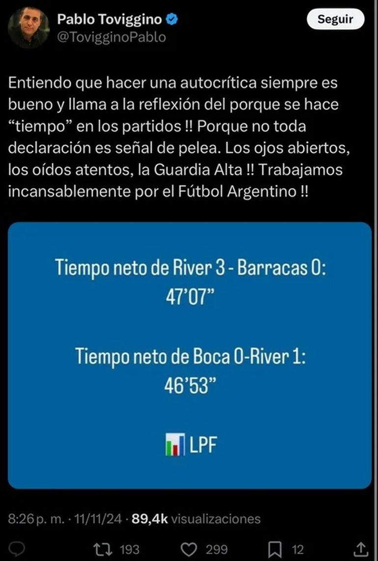 En el mismo posteo, Toviggino detalló que en el partido entre River y Barracas del último fin de semana se jugaron 47 minutos y 7 segundos de tiempo neto y lo comparó con el último Superclásico, que terminó en victoria del “Millonario”, en el que se disputaron 14 segundos menos.
