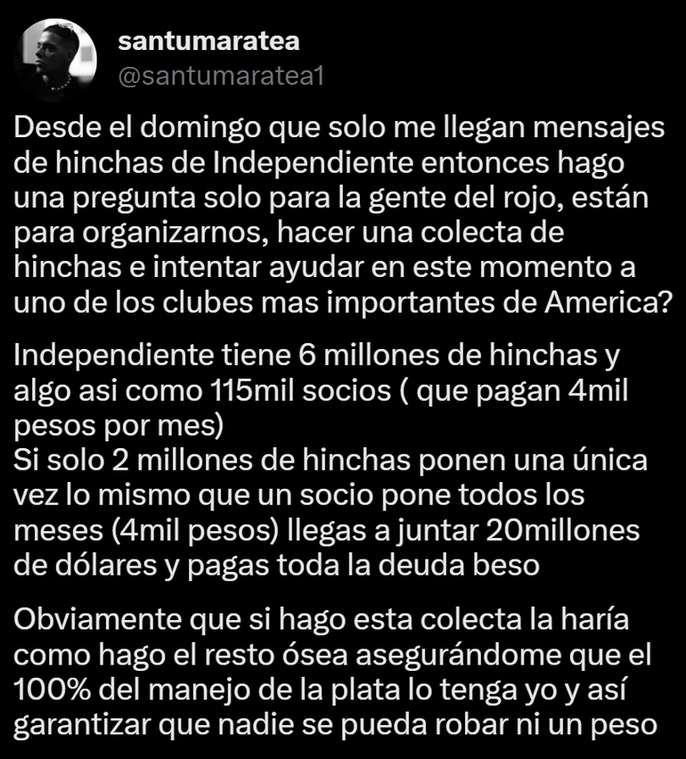 La propuesta implicaría que dos millones de personas pongan por única vez 4 mil pesos y así llegar a los 20 millones de dólares, parte de la gran deuda que tiene hoy Independiente. "Independiente tiene 6 millones de hinchas y algo así como 115.000 socios (que pagan $4.000 por mes). Si sólo 2 millones de hinchas ponen una única vez lo mismo...", escribió en las redes.