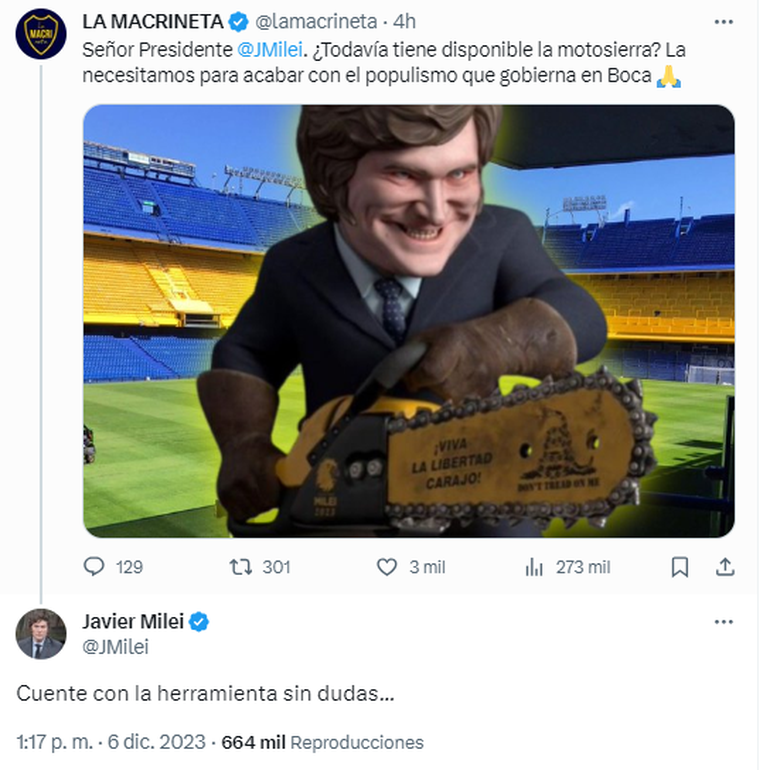 La cuenta de X (Twitter) que más banca a la lista Ibarra-Macri es "@lamacrineta" que es manejada por un operador mediático. En su perfil compartió una foto animada de Milei con una motosierra y el texto: "Señor presidente @javiermilei Todavía tiene disponible la motosierra? La necesitamos para acabar con el populismo que gobierna en Boca".