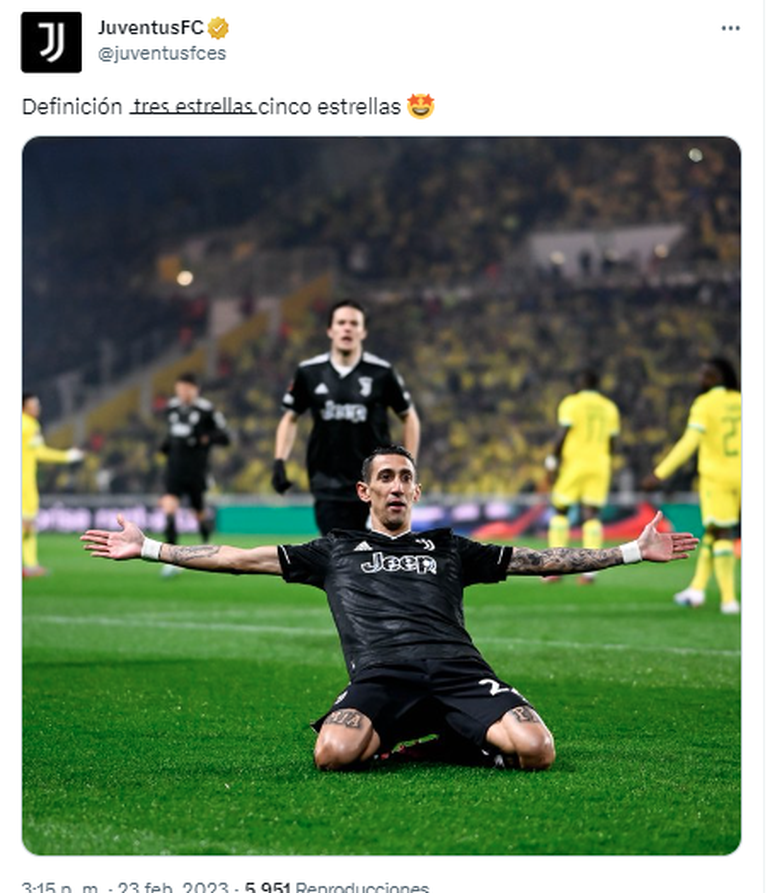 Di María, campeón del mundo con el seleccionado argentino en Qatar 2022, anotó un golazo a los 5 minutos del primer tiempo; marcó de penal a los 20minutos tras una lujosa jugada personal que derivó en una mano de un defensor del nantes para evitar el gol; y cerró de cabeza su cuenta personal y la de la "Juve" a los 33 minutos de la segunda parte.