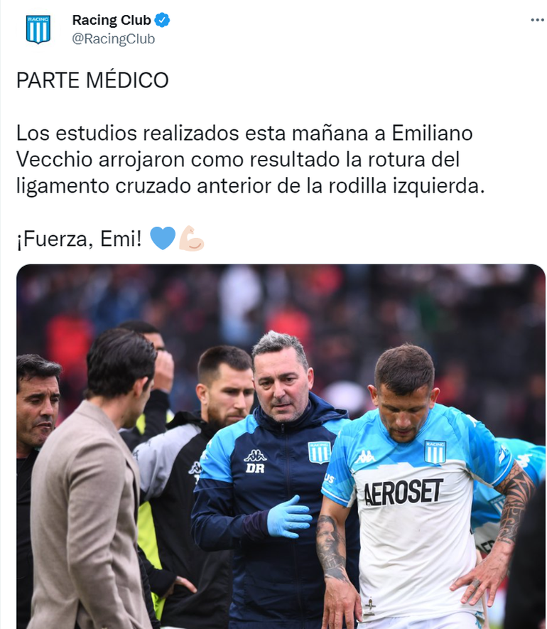 Racing confirmó este sábado que el mediocampista Emiliano Vecchio sufrió la rotura del ligamento cruzado anterior de su rodilla izquierda en el partido disputado el viernes ante Colón (2-0) en Santa Fe por la 25ta. fecha de la Liga Profesional de Fútbol (LPF).