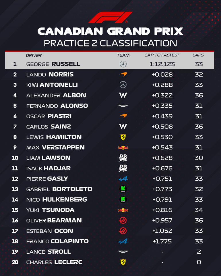 El líder de la práctica fue el británico de Mercedes, George Russell con un tiempo de 1:12.123, por detrás lo siguió el conductor de McLaren, Lando Norris (1:12.151) y el italiano Kimi Antonelli (1.12.411).