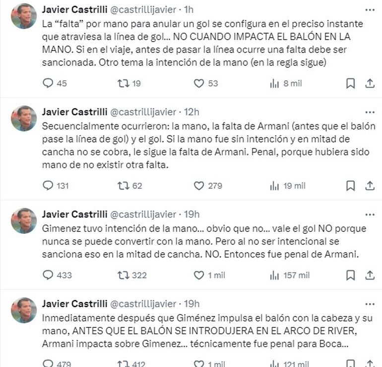 Una de las opiniones que trascendió en las redes sociales fue la del histórico ex arbitro Javier Castrilli que, a través de su cuenta personal de X (ex Twitter), opinó sobre la jugada: "Inmediatamente después de que Giménez impulsa el balón con la cabeza y su mano, antes de que el balón se introdujera en el arco de River, Armani impacta sobre Giménez... técnicamente fue penal para Boca", dijo sobre la posibilidad de que se sancione penal del arquero Franco Armani sobre el delantero.