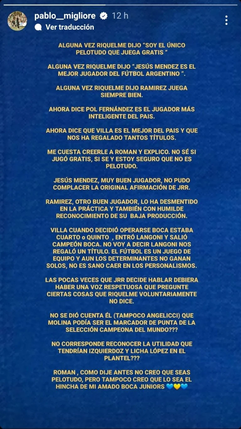 Para terminar con su mensaje, Pablo Migliore le habló directamente al Vicepresidente de Boca: "Román, como dije antes no creo que seas pelotudo, pero tampoco creo que lo sea el hincha de mi amado Boca Juniors".