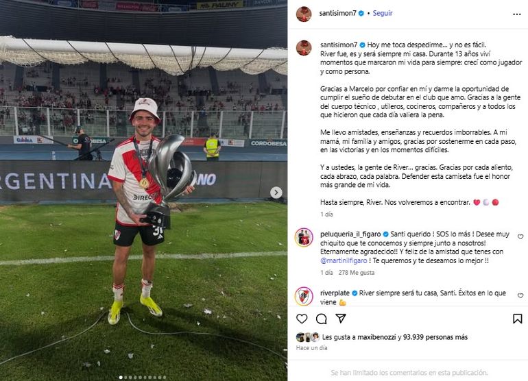 "Hoy me toca despedirme… y no es fácil", comenzó relatando en un posteo y sumó: "River fue, es y será siempre mi casa. Durante 13 años viví momentos que marcaron mi vida para siempre: crecí como jugador y como persona. Gracias a Marcelo (Gallardo) por confiar en mí y darme la oportunidad de cumplir el sueño de debutar en el club que amo. Gracias a la gente del cuerpo técnico , utileros, cocineros, compañeros y a todos los que hicieron que cada día valiera la pena", agradeció.