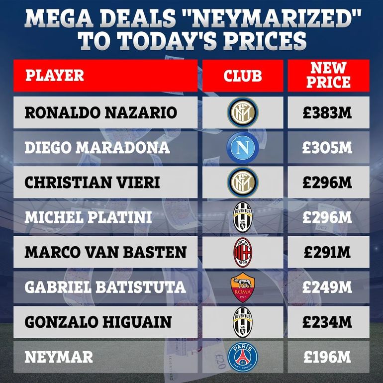 El podio del "Neymarizer" lo cierran de manera conjunta Christian Vieri y Michel Platini, quienes sumarían hoy 296 millones de libras esterlinas (358 millones de dólares). En el quinto escalón aparece Marco van Basten, con 291 millones de libras esterlinas (352 millones de dólares), considerando su pase del Ajax al Milan en 1987.