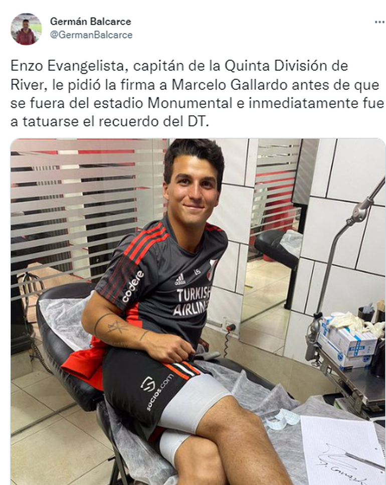 Enzo Evangelista, capitán de la quinta división de River, fue uno de los pibes del club que aguardaban por el Muñeco. El juvenil, al que algunos lo definen como el futuro Enzo Pérez, le pidió un autógrafo a Gallardo.