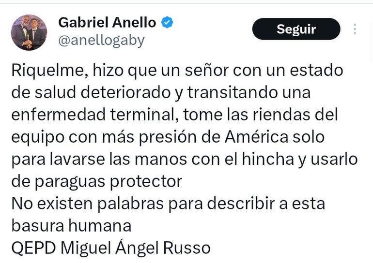 "Riquelme, hizo que un señor con un estado de salud deteriorado y transitando una enfermedad terminal, tome las riendas del equipo con más presión de América solo para lavarse las manos con el hincha y usarlo de paraguas protector. No existen palabras para describir a esta basura humana. QEPD Miguel Ángel Russo", escribió en su cuenta de X.