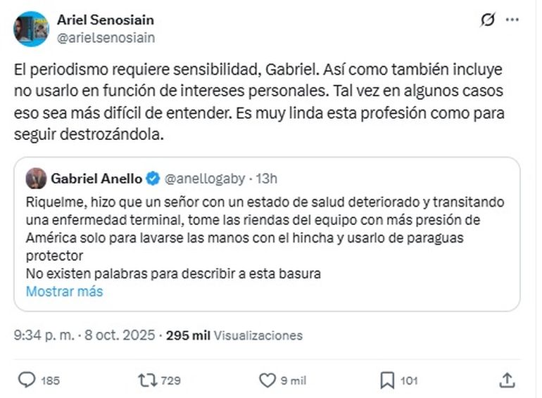 Senosiaín citó el tuit de Anello y respondió: "El periodismo requiere sensibilidad, Gabriel. Así como también incluye no usarlo en función de intereses personales. Tal vez en algunos casos eso sea más difícil de entender. Es muy linda esta profesión como para seguir destrozándola".