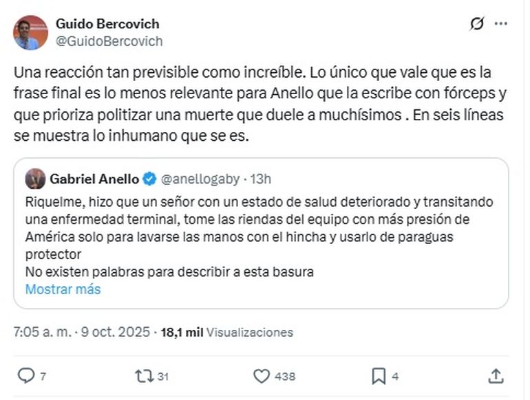 "Una reacción tan previsible como increíble. Lo único que vale que es la frase final es lo menos relevante para Anello que la escribe con fórceps y que prioriza politizar una muerte que duele a muchísimos . En seis líneas se muestra lo inhumano que se es", publicó Bercovich en "X".