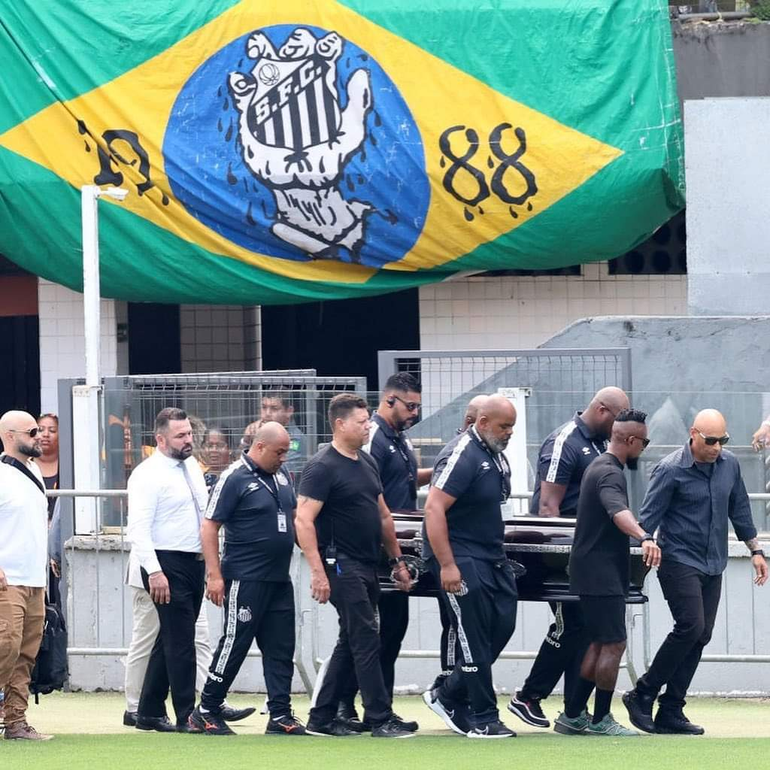 El féretro de Pelé llegó este lunes por la mañana desde el hospital Albert Einstein de San Pablo, a 70 kilómetros de distancia, adonde falleció luego de un mes de internación, y fue llevado hasta el centro del campo de juego por su hijo Edinho, exarquero que tuvo problemas judiciales por drogas y que es el entrenador del Londrina, del ascenso, y por el futbolista exmundialista Zé Roberto, exSantos exPalmeiras y Bayern Münich.