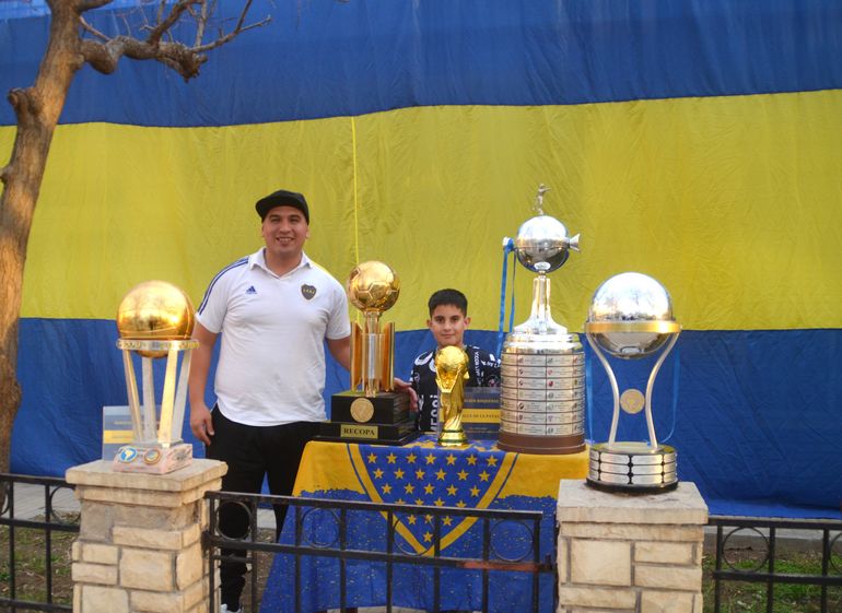 Un vecino del barrio San Pablo dio la nota este sábado al embanderar su casa con un trapo gigante azul y otro y exhibir réplicas de los trofeos más importantes que obtuvo el xeneize. Y hasta expuso en ese improvisado museo en la vereda una copia de la Copa del Mundo que logró Argentina en Qatar 2022.