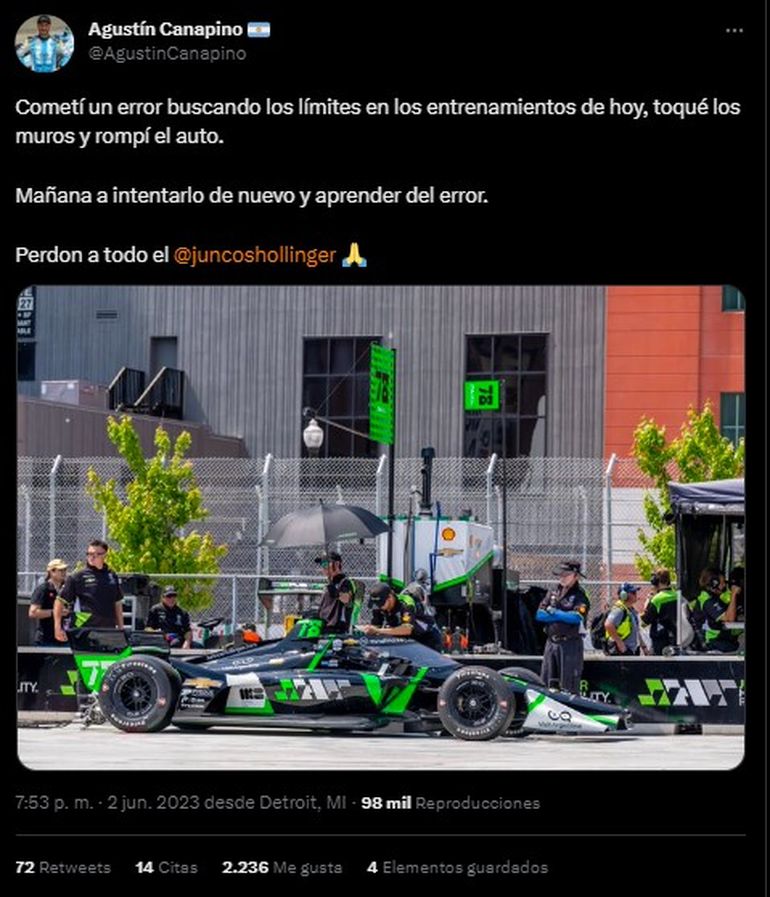 Agustín Canapino busca dejar atrás el trago amargo sucedido el pasado fin de semana en las 500 millas de Indianápolis. Es por eso que el piloto se prepara para lo que será el circuito en Detroit. Sin embargo, en las prácticas ya tuvo complicaciones y se golpeó contra un muro.