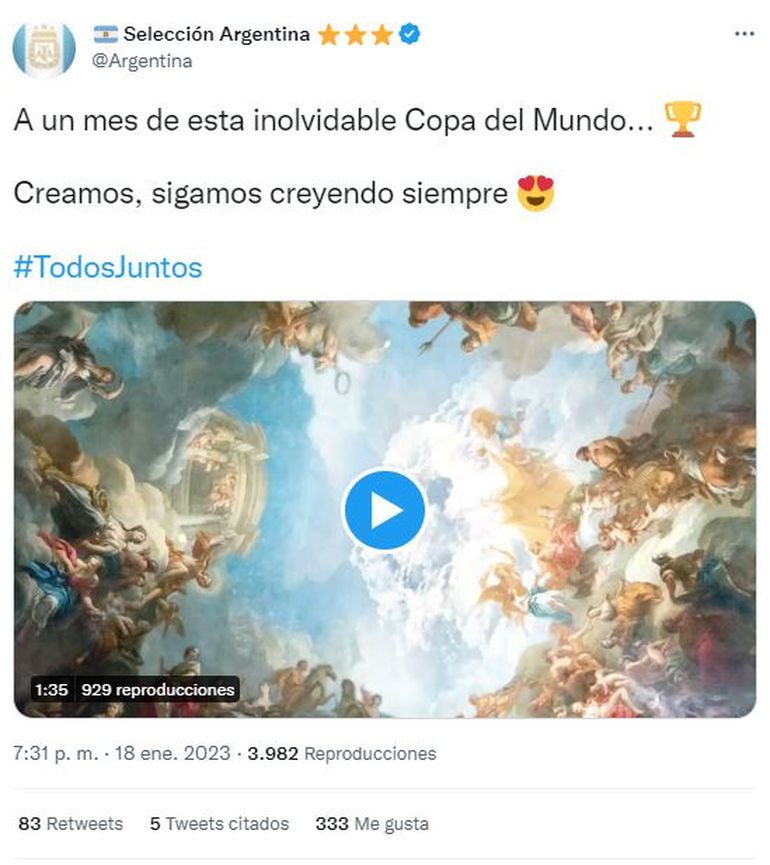 "A un mes de esta inolvidable Copa del Mundo... Creamos, sigamos creyendo siempre #TodosJuntos", acompaña el posteo del video que, en menos de una hora, ya superaba las 60 mil reproducciones en Twitter.