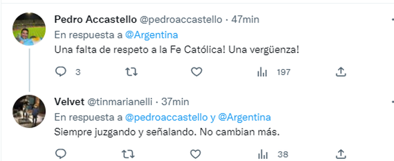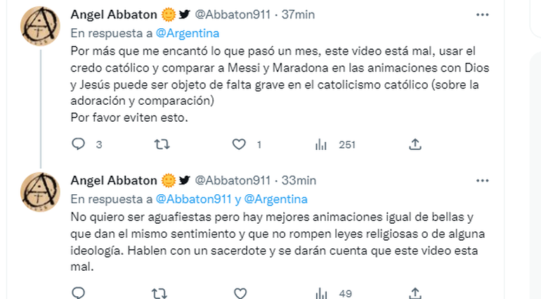 "Por este video volví a ser católica", "por este video soy religioso", fueron algunas de las reacciones que celebraban el contenido. Por otra parte, estuvieron quienes no lo vieron con buenos ojos. "Por más que me encantó lo que pasó un mes, este video está mal, usar el credo católico y comparar a Messi y Maradona en las animaciones con Dios y Jesús puede ser objeto de falta grave en el catolicismo católico (sobre la adoración y comparación)", comentó el usuario Ángel Abaton.