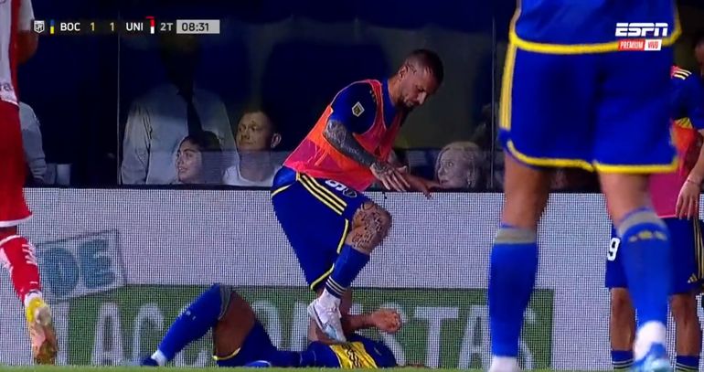 Es que el delantero de Boca se encontraba realizando la entrada en calor. Es por eso que al ver que su compañero se venía contra él a gran velocidad y tras ser empujado, él sólo atinó a prepararse para el impacto y levantar la pierna en el afán por no lastimarlo.