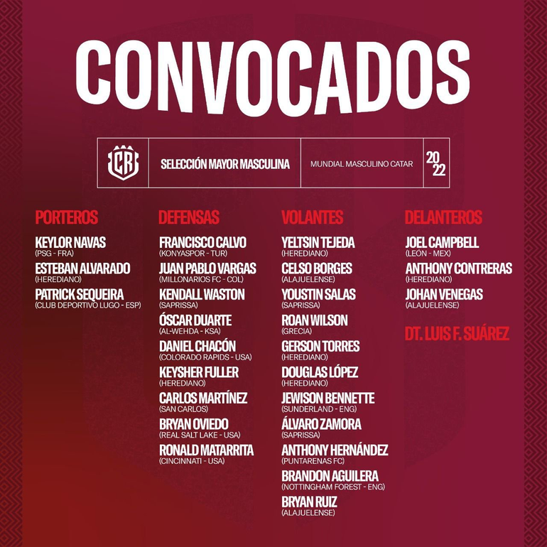 El técnico Luis Fernando Suárez nominó este jueves los 26 integrantes de la lista definitiva de la selección de Costa Rica, de cara al Mundial Qatar 2022, que comenzará el domingo 20 de noviembre. El equipo tico fue el primer equipo latinoamericano en anunciar el plantel definitivo.