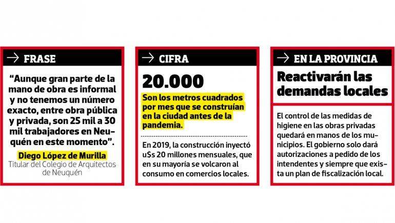 Hoy, el funcionario tendrá una reunión virtual con representantes de la Cámara Argentina de Construcción y los colegios de ingenieros, arquitectos, agrimensores y técnicos de Neuquén para acordar un protocolo. Explicó que el objetivo es reanudar la actividad "lo antes posible", por el peso que tiene en la economía local.