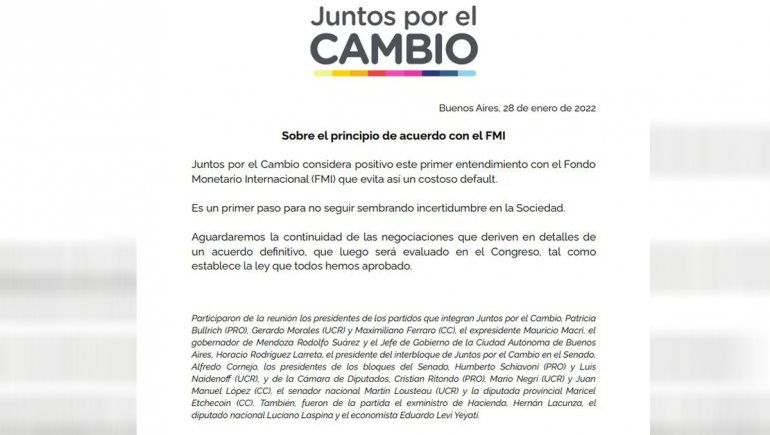 Con un acotado comunicado, desde la Mesa Nacional de JxC consideraron el acuerdo con el FMI como “positivo” porque “evita un costoso default” y lo calificaron como el “primer paso para no seguir sembrando incertidumbre en la sociedad”.