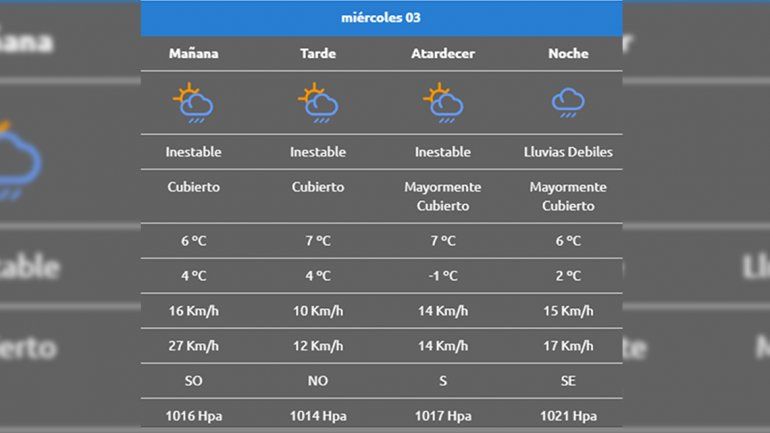 De esta forma, para el miércoles se espera una temperatura que oscilará entre los -1°C y 7°C. El cielo estará cubierto y las ráfagas de viento alcanzarán los 27 km/h. Las probabilidades de lluvias se mantendrán durante todo el día.