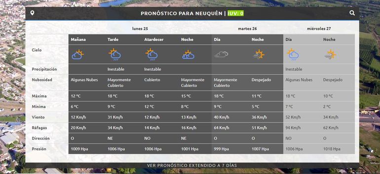 Para el Alto Valle, el lunes se anticipa como una jornada mayormente nublada, donde la temperatura mínima no superaría los 6°C, mientras que la máxima podría escalar hasta los 18°C. Mientras que, por la tarde se pronostican lluvias leves que podrían extenderse hasta la noche.