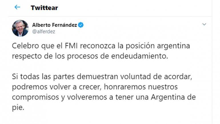 A través de su cuenta de Twitter, el primer mandatario señaló: "Celebro que el FMI reconozca la posición argentina respecto de los procesos de endeudamiento". Y agregó "Si todas las partes demuestran voluntad de acordar, podremos volver a crecer, honraremos nuestros compromisos y volveremos a tener una Argentina de pie".