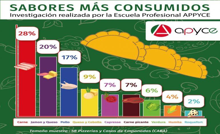 Según la Asociación de Pizzeros y Casas de Empanadas de nuestro país (APYCE) las más consumidas son las de “carne” con un 28%, seguidas por las de “jamón y queso” con un 20%, y en tercer lugar de “pollo” con un 17%.