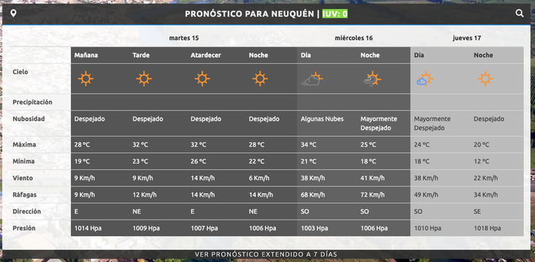 De acuerdo al pronóstico, el miércoles será el último día típico de verano, al menos por esta semana. Se espera una jornada de calor y viento fuerte en el Alto Valle. La máxima se trepará hasta los 34 grados y la mínima estará en los 21 grados durante el día. Por la noche, la máxima estará en los 25 grados y la mínima en los 18 grados. El cielo estará mayormente despejado durante gran parte del día. El viento, proveniente del sector sudoeste, estará en los 41 kilómetros por hora y las ráfagas podrían llegar hasta los 72 kilómetros por hora.