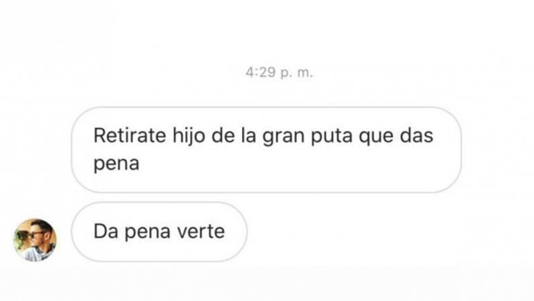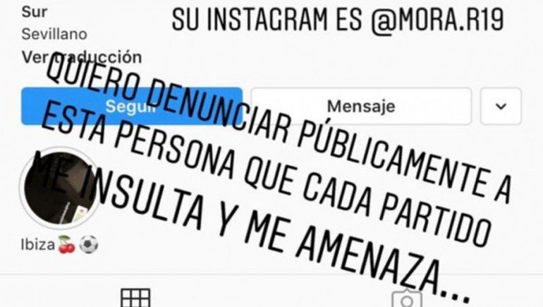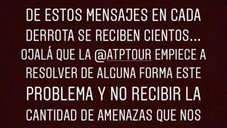 "Quiero denunciar públicamente a esta persona que cada partido me insulta y me amenaza", escribió el tenista, 15° del mundo, en sus historias de Instagram sobre una captura de pantalla de la cuenta @mora.r19. Y subió un par de imágenes donde muestra el tipo de mensajes que recibe por parte de este usuario.