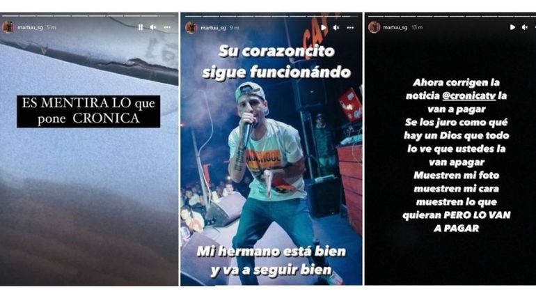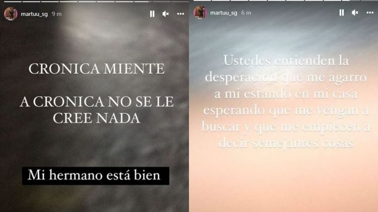 "Crónica miente. A Crónica no se le cree nada. Mi hermano está bien", escribió la hermana de El Noba en las historias de su cuenta de Instagram. "Ustedes entienden la desesperación que me agarró estando en mi casa esperando que me vengan a buscar y que me empiecen a decir semejantes cosas", agregó.