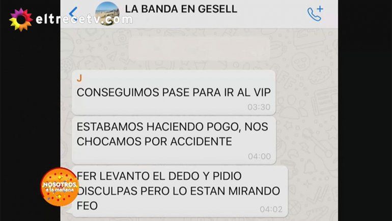 "Estábamos haciendo pogo, nos chocamos por accidente. Fer levantó el dedo y pidió disculpas pero lo están mirando feo", dice uno de los primeros mensajes, enviado a las 4 am. A los cuarenta minutos de ese suceso, el grupo de rugbiers ya le estaba pegando a Fernando y sus amigos. "Che, nos están pegando", dijo uno de los chico identificado como "T". "Vinieron de atrás, son una banda, nos están dando piñas", agregó.