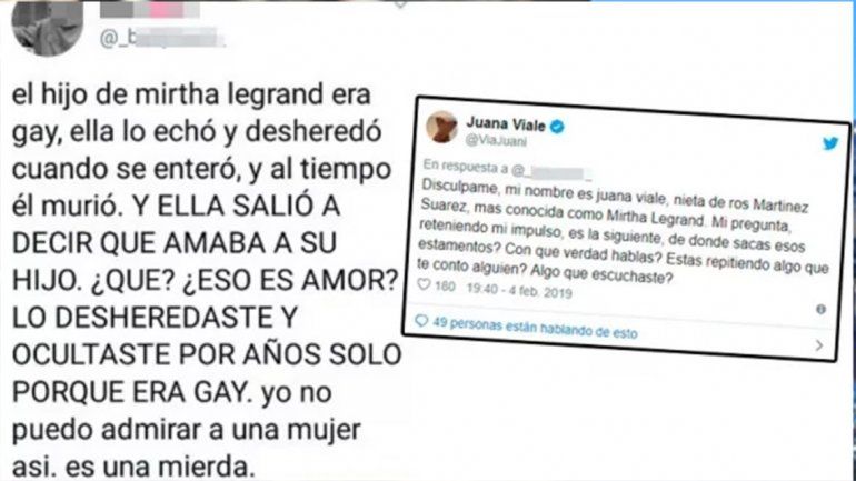 Sin disimular su bronca, la ex conductora de Me gusta tu canción le respondió furiosa: "Disculpame, mi nombre es Juana Viale, nieta de Rosa Martínez Suárez, más conocida como Mirtha Legrand. Mi pregunta, reteniendo mi impulso, es la siguiente: ¿de dónde sacás esos testamentos? ¿Con qué verdad hablás? ¿Estás repitiendo algo que te contó alguien? ¿Algo que escuchaste?", escribió Juana, en defensa de su abuela y echando por tierra la escandalosa versión.