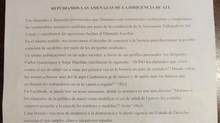 "Los diputados y diputadas provinciales que firmamos este comunicado, rechazamos y condenamos las inadmisibles amenazas recibidas por parte de la conducción de la Asociación Trabajadores del Estado y las agresiones hechas al Diputado Escobar. En el mismo sentido, nos reservamos el derecho de concurrir a la Justicia para determinar la posible comisión de un delito, por parte de los dirigentes sindicales", dice el texto enviado.