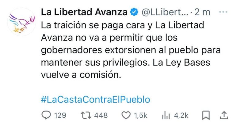 Además, remarcan que "no corresponde entonces que nos responsabilicen a todos por igual ni que nos falten el respeto aduciendo poca vocación de diálogo e incapacidad de nuestra parte, cuando en realidad trabajamos incansablemente para lograr los consensos necesarios para que se apruebe la Ley Bases".