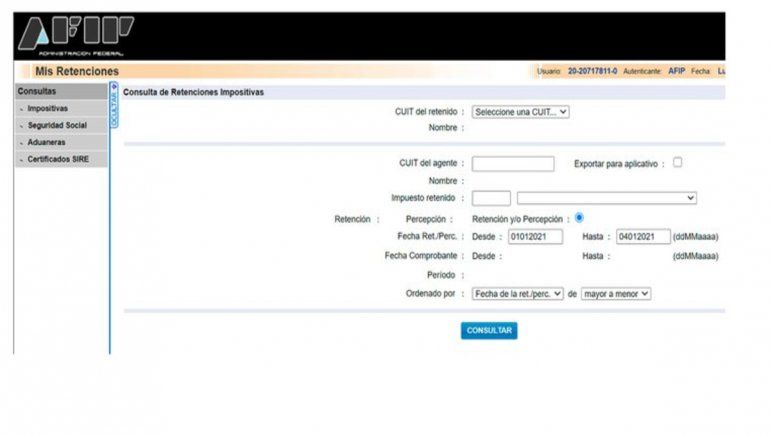 Tras llenar los campos correspondientes a los datos personales del contribuyente y elegir la retención a consultar, se deberá optar por la percepción de 35% asociada al “impuesto PAIS” y luego seleccionar el intervalo de fechas. Cabe recordar que el impuesto PAIS, del 30%, no tiene devolución.