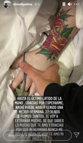 Su hermano Dino la despidió en las redes sociales con una foto y un breve y conmovedor texto. “Hasta el último latido de la mano. Gracias por esperarme, nadie puede haber tenido una mejor hermana. 22:31 nos fuimos juntos. Te voy a extrañar mucho, sé que sabés lo mucho que te amo y gracias por ser mi hermana. Nunca me voy a olvidar de vos! Te amo, mi angelito”, publicó.