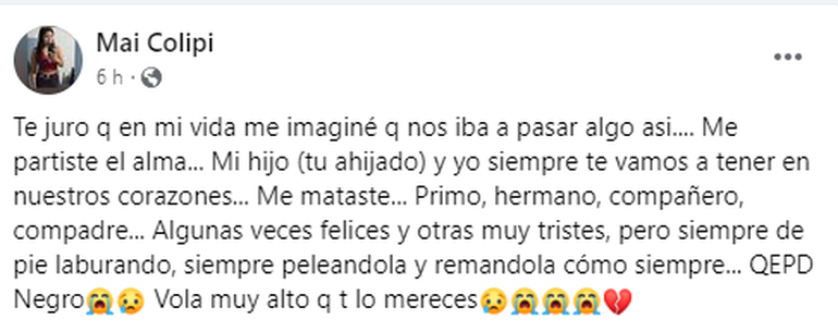 "Tipo humilde sin maldad y muy dedicado a su trabajo. Gracias por esos momentos en el que los nerviosos de las tareas que realizábamos nos llevaban a tirarnos algún chiste y reírnos, pasarnos algún dato de siniestros por mensajes o simplemente charlar de la vida cuando nos encontrábamos", manifestó con mucho dolor.