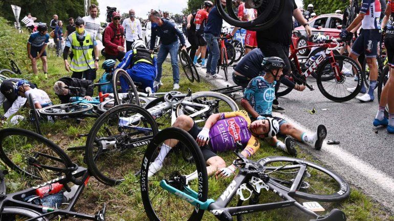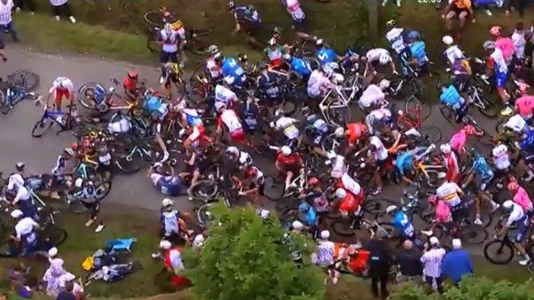 Uno de los competidores, Tony Martin (del Jumbo Visma), que iba segundo, chocó con el letrero, cayó al piso y todos los ciclistas que venían tras él también se desplomaron.