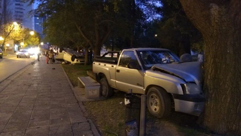 Por el impacto, la camioneta Chevrolet S10 cabina simple quedó incrustada en un árbol sobre el bulevar, mientras que el auto quedó volcado sobre la esquina.