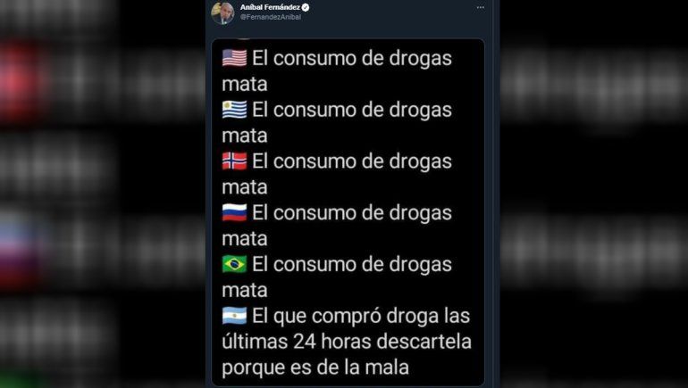La polémica comenzó cuando Fernández tuiteó este miércoles por la noche un meme en la que se muestra banderas de distintos países junto a la leyenda "El consumo de drogas mata" en referencias a políticas estatales.