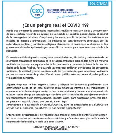 En una dura solicitada del Centro de Empleados de Comercio (CEC), bajo el título "¿Es un peligro real el Covid-19?", el secretario general Sergio Rodríguez, le reclama al Ministerio de Salud que exija el cumplimiento de los protocolos sanitarios en los supermercados y mayoristas de la ciudad.