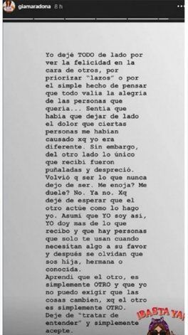 Giannina también expresó su bronca y lanzó un mensaje catártico en Instagram Stories que concluye con un "Basta Ya".