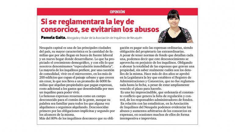 Catalina Uleri, miembro del Colegio de Martilleros y Corredores Públicos de Neuquén, comentó que es el propietario quien se tiene que hacer cargo de las expensas si vive en el departamento. En tanto que corresponde al inquilino abonarlas en el caso de que esté alquilado.