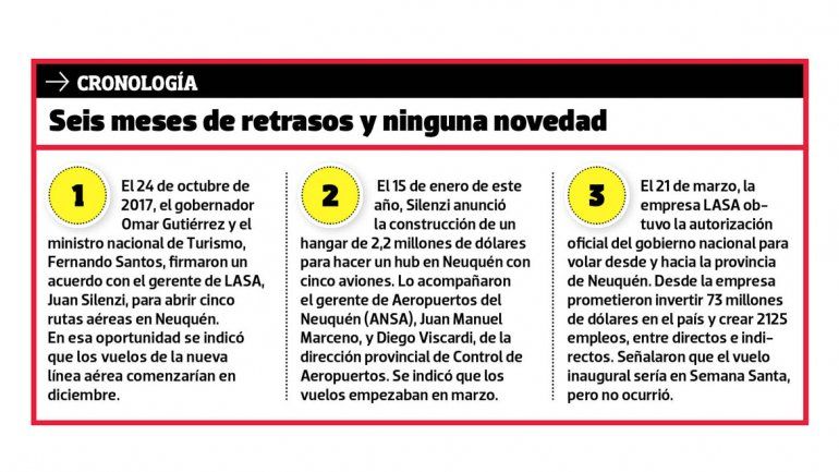 A seis meses del anuncio de los vuelos de LASA en Neuquén, todavía no hay fecha para la construcción del hangar donde se guardarán los aviones. Por un acuerdo entre privados, la aerolínea iba a hacer la obra con el financiamiento de la concesionaria del aeropuerto, pero el dinero no aparece. Ante la demora, está en riesgo la inversión millonaria comprometida en la provincia y más de cien puestos de empleo.