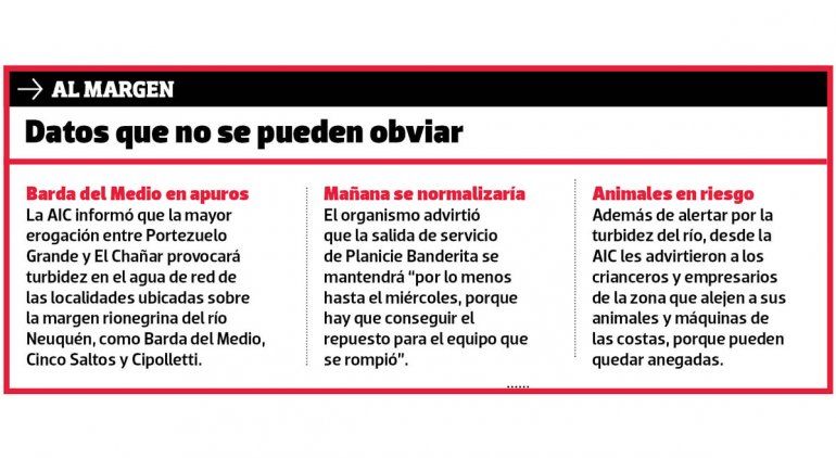 El domingo, la Autoridad Interjurisdiccional de Cuencas (AIC) informó que una falla en Planicie Banderita obligó a erogar más agua por el río Neuquén desde Portezuelo Grande hacia San Patricio del Chañar. El caudal habitual en ese tramo es de 12 metros cúbicos por segundo, pero ayer llegó hasta los 60 metros cúbicos por segundo, debido a las maniobras obligadas por el desperfecto en Planicie Banderita. Para hoy, se estima que el caudal podría llegar a un máximo de 75 metros cúbicos por segundo, una medida que obliga a tomar recaudos a los pobladores de la ribera del río.