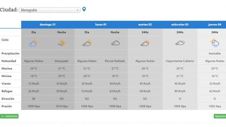 El lunes 1° de enero de 2018 estará algo nublado durante gran parte del día pero con una temperatura máxima de 31°C y una mínima de 18°C hacia la noche. En tanto que el viento será de unos 44 km/h con ráfagas que podrían llegar a los 63 km/h.